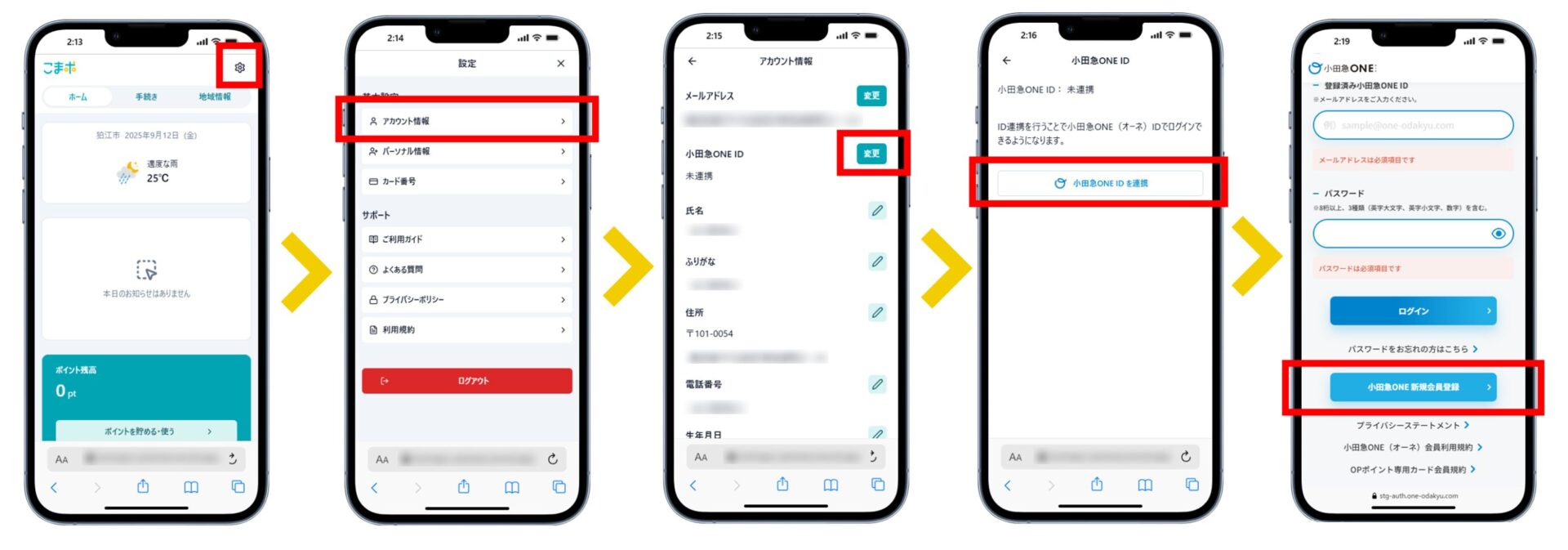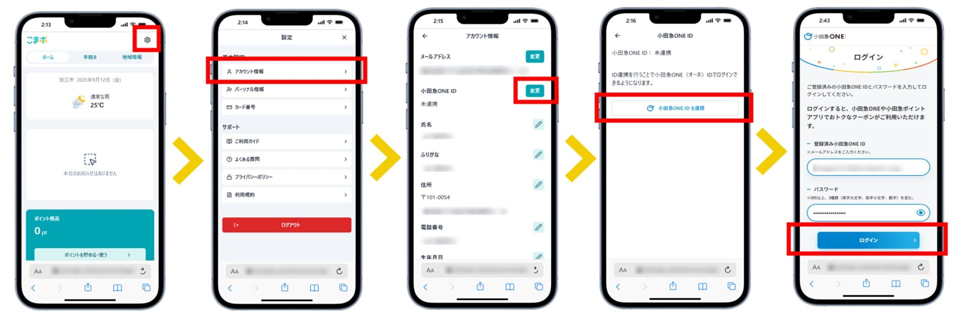 こまポにログインしてから、こまポのアプリ内で小田急ONE IDを連携する手順です。