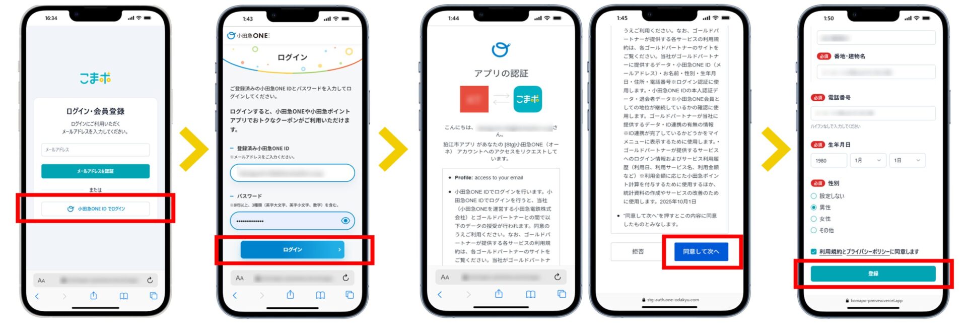 ログイン画面で「小田急ONE IDでログイン」を選び、そこからこまポと連携します。